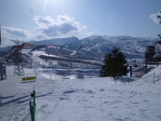 この日は快晴。さぁ春スキーと意気込んだがロープウェイ乗り場付近とは異なり、ゲレンデの最高気温はマイナス3℃。田代ロープウェイ山頂駅の一足早い鯉のぼりはちょっと寒そうでした。一日中アイスバーンでしたが平日で人もまばらなこともあり、テレマークスキーとアルペンの両方でカービングターンでかっ跳び楽しみました。コブには苦労しましたが...。このスキー場はまだ他のスキー場がopenしている時はねらい目かも?