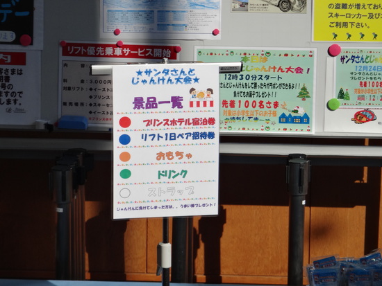 サンタとじゃんけんをして、勝つとガラポンを回す権利が得られます。ガラポンの賞品は、プリンスホテル宿泊券やリフト券など豪華!