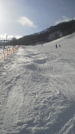 駐車場からリフトまでかついで上る。古典的なスキー場の代表ですね。一本リフトを乗り継ぐとメインゲレンデに出ます。開放感に溢れており、やる気を引き出させてくれます。